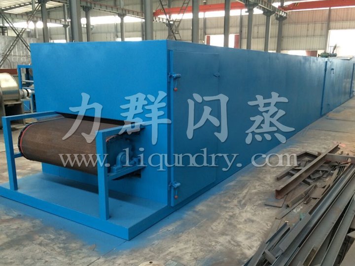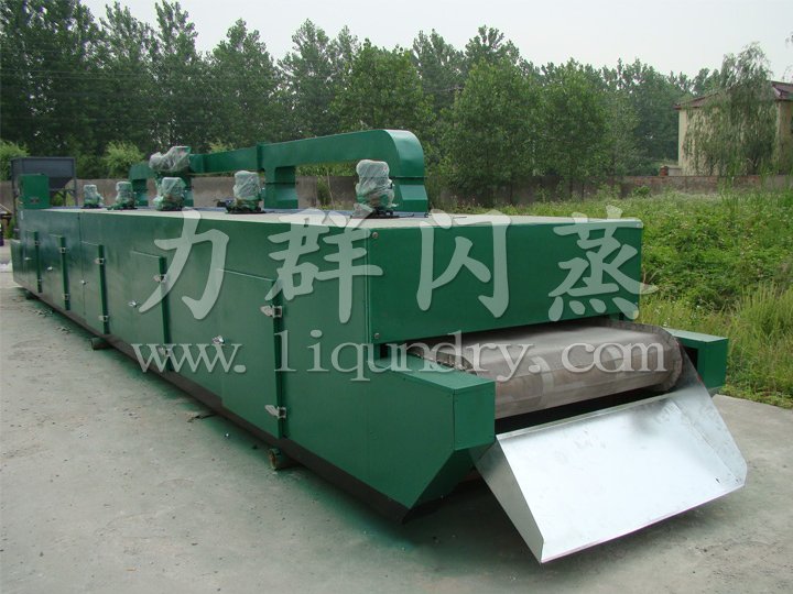 物料由加料器均勻地鋪在網帶上,網帶一般采用12-60目不銹鋼絲網,由傳動裝置拖動在干燥機內移動。干燥機由若干單元組成,每一單元熱風獨立循環,部分尾氣由專門排濕風機排出,廢氣由調節閥控制,熱氣由下往上或由上往下穿過鋪滿物料的網帶完成熱量與質量傳遞的進程,帶走物料水份。網帶緩慢移動,運行速度可根據物料溫度自由調節,干燥后的成品連續落入收料器中。上下循環單元根據用戶需要可靈活配備,單元數量亦可根據需要選取。