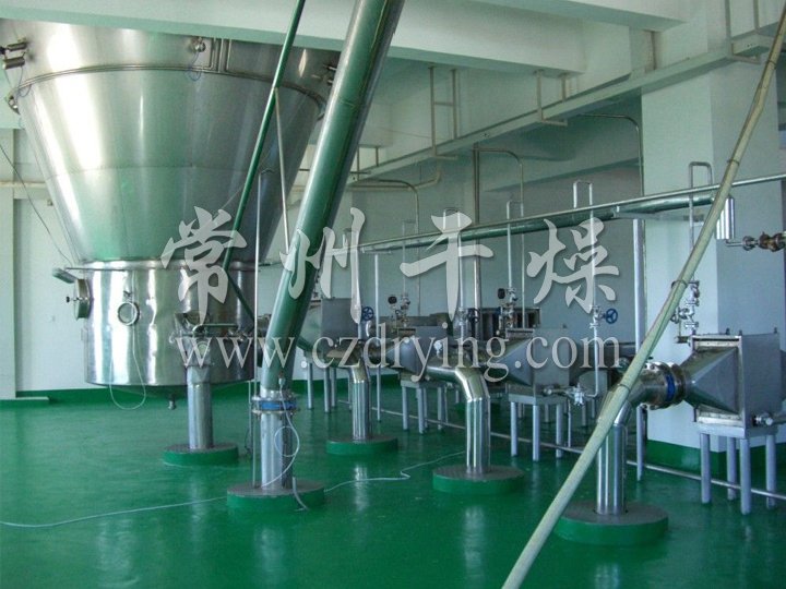 該生產線由供料系統、介質循環系統、空氣加熱凈化系統、干燥塔系統、收料系統、控制系統等多個系統整合而成。主塔系統集中了目前噴霧干燥工程的所有尖端技術,噴干機組的收料系統由一級旋風分離器+布袋除塵器組合形成。一級旋風采用高氣量高效率旋風進行收集,其收粉率能達到96%左右分,而布袋除塵器是針對蛋白粉類除塵專門設計的優化設備,能使物料與風進行完全分離并沉降,布袋為拒水防油防靜電布袋,過濾目數可達500目以上。